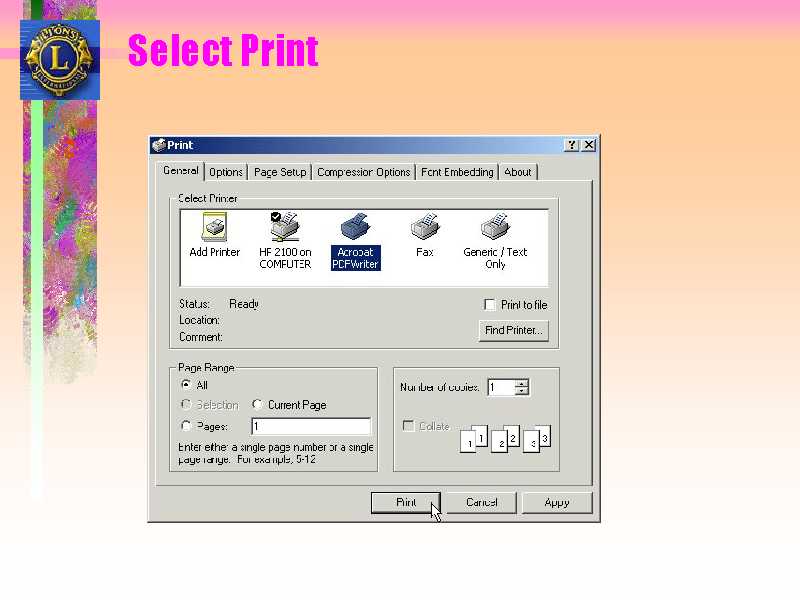 Your printer dialog box appears when you use the Print function. This differs on every computer setup. I am certain that you have done this with many other documents on your computer.